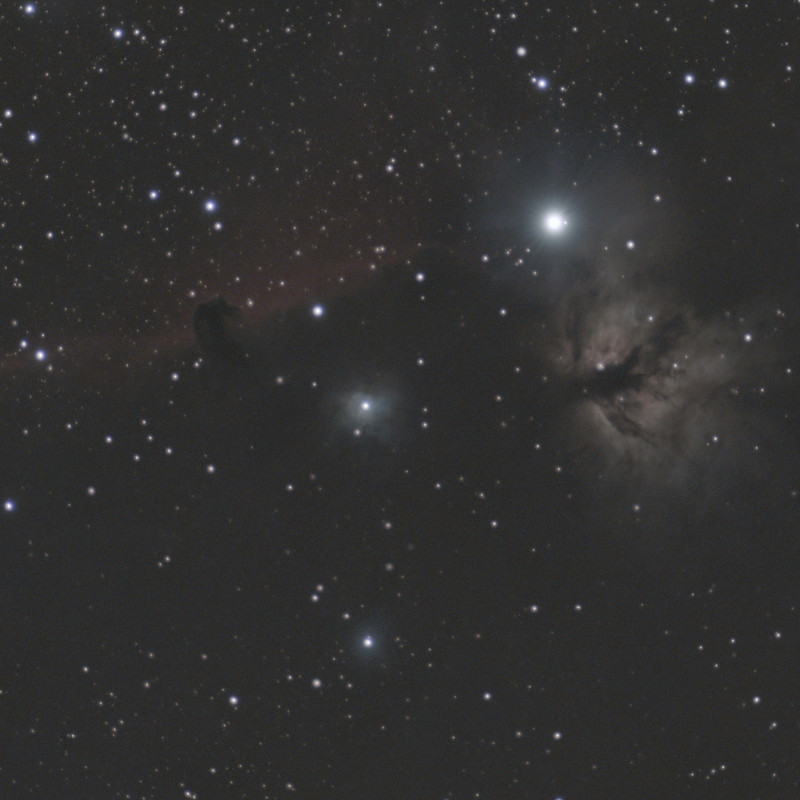 Настал вечер шестого дня отдыха в Крыму. Очередная фотосессия на 4-5 часов холодной ночью. За это время получилось отснять туманность “Колдун” (NGC 7380), но пока не смог по нормальному обработать материал. Слишком много шума получается на фотографии. Однако, ближе к трем часам ночи высоко над горизонтом поднималось созвездие Ориона, которое знаменито своей большой туманностью, звездой Бетельгейзе (которая уже вот-вот взорвется, а может и нет) и более мелкими туманностями, в частности “Конская голова” и “Пламя”, о которых и пойдет речь.