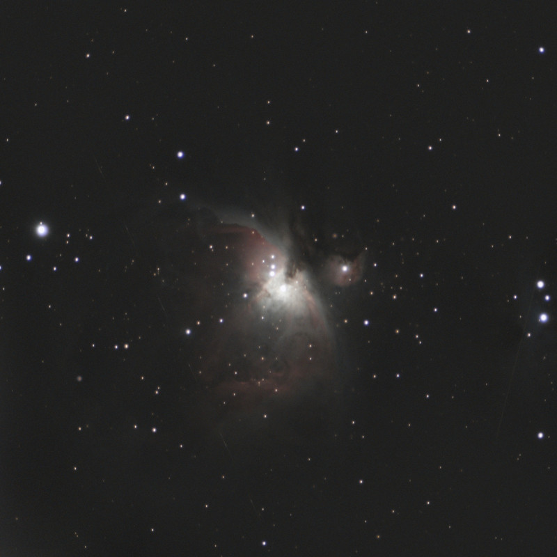 Плюс, дополнительно поэкспериментировал со съемкой М42 (Большая туманность в Орионе). Монтировка стояла не очень удачно, поэтому в часть кадра попало дерево и о съемке серии дело не шло, тем не менее, пару одиночных кадров на полторы минуты удалось получить. И даже на этих полутора минутах видно многое, т.к. туманность довольно яркая сама по себе.