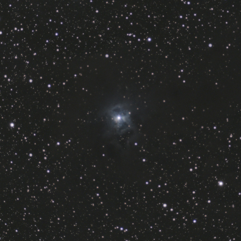 Ночь с 21 на 22 сентября была очень длинной и кроме “Конской головы” и “Колдуна” успел понаблюдать и созвездия в зените. По программе Stellarium нашел в созвездии Цефея маленькую туманность под названием Ирис (Iris Nebula). Маленькая она, однако, только на кадре и по угловым размерам (10,0’ × 8,0’, т.е. около трети диска полной Луны). В реальности же это огромная область около 3 световых лет в поперечнике. Для сравнения расстояние от Солнца до ближайшей звезды (α Centauri) всего около 4.3 световых года
